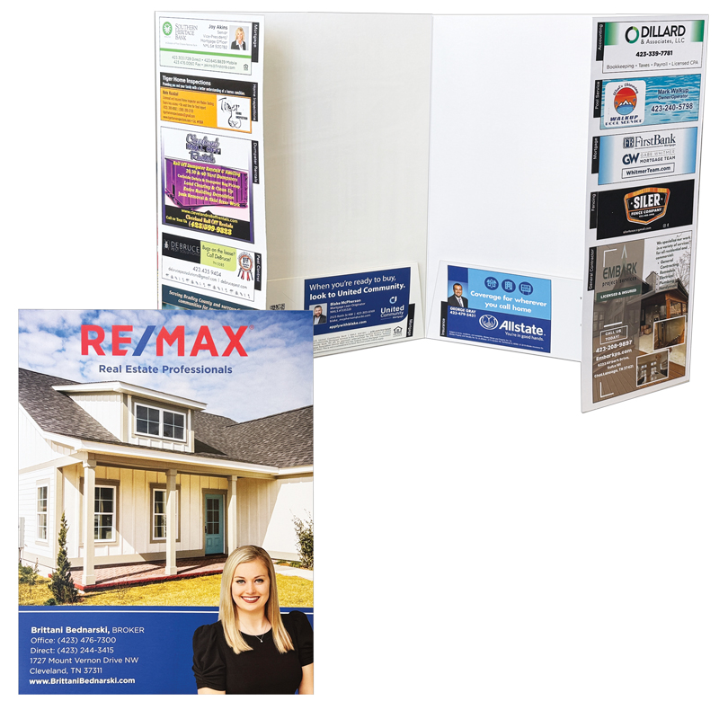 - 9" x 12" closed with two 3" unglued pockets and a 4 3/8" wide info flap off the front and back cover. Flap is perfect to spotlight important information, company profiles or vertical market ads.